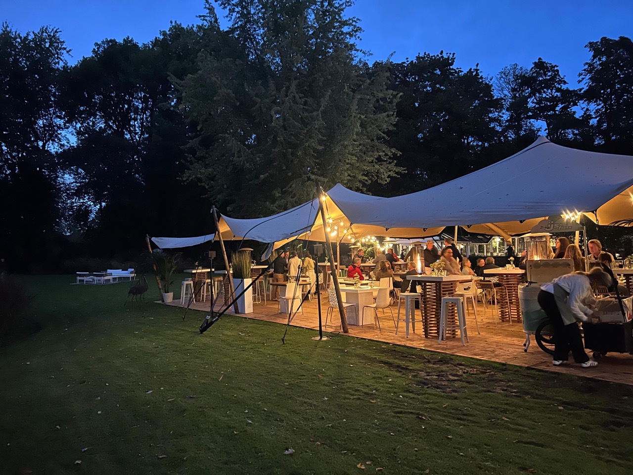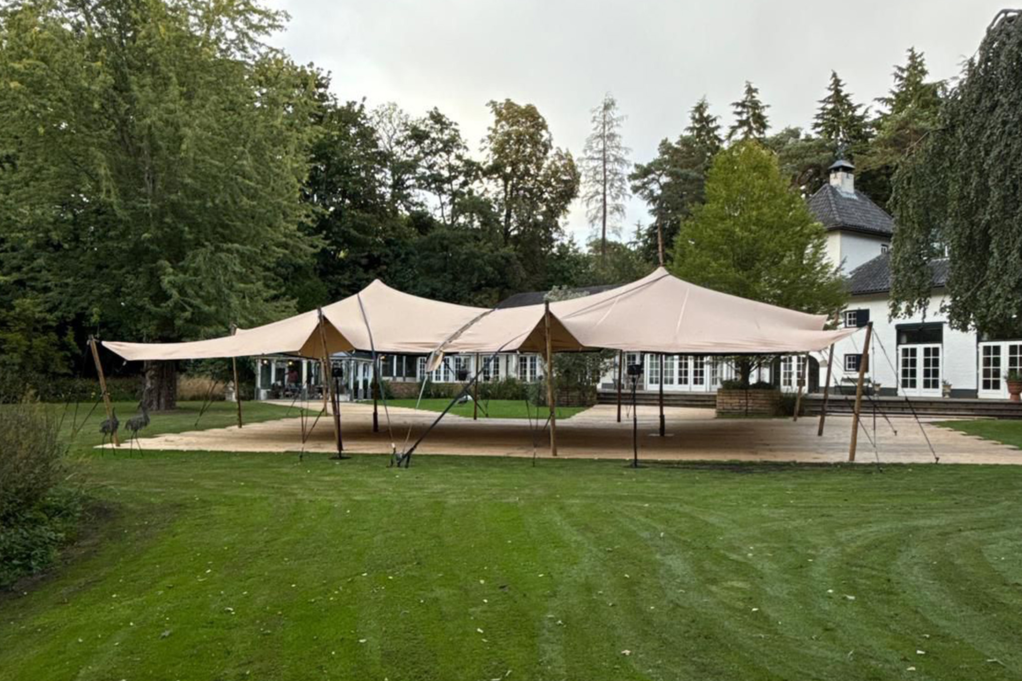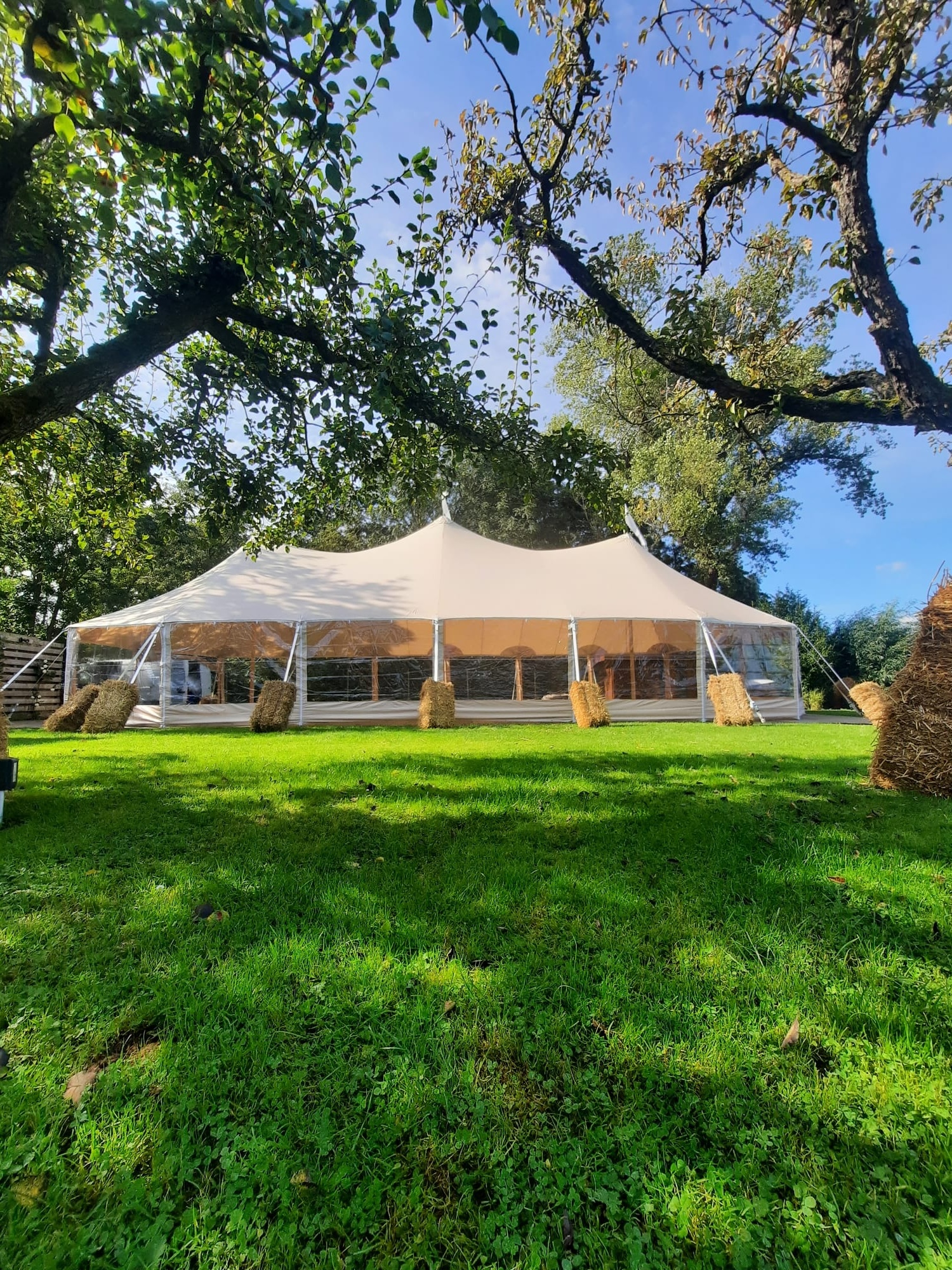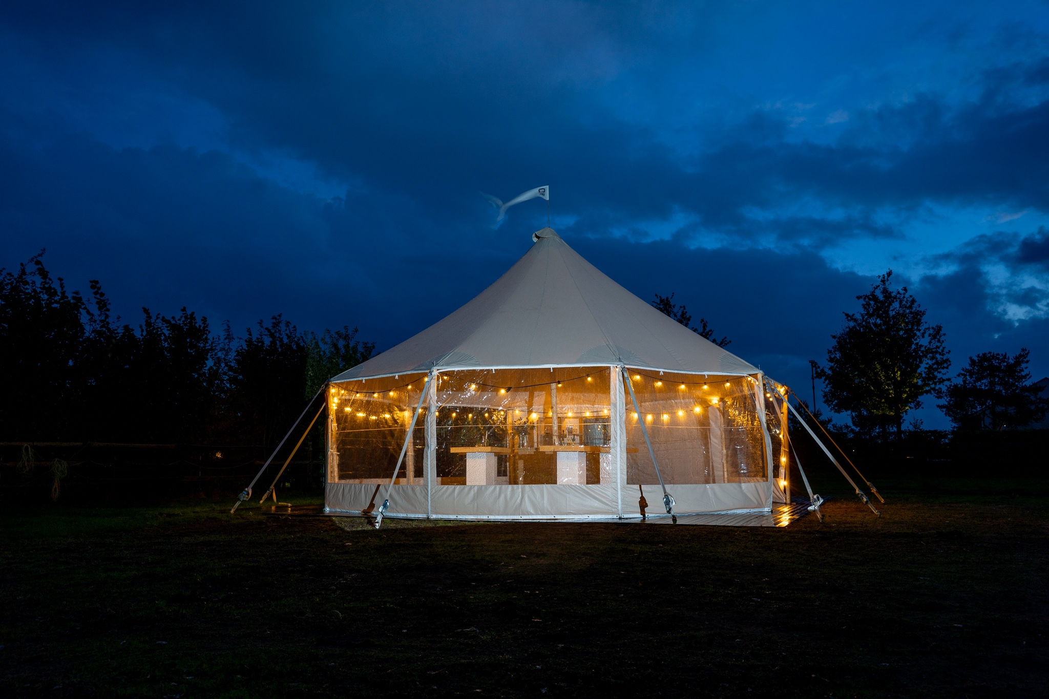 Diese Zelte sind ideal für Hochzeiten, Abendessen, Feierlichkeiten und hochwertige Firmenveranstaltungen. Dank des offenen, luftigen Designs entsteht eine wunderschöne Verbindung zur Umgebung – perfekt für Locations in der Natur, auf Landgütern oder in einem großzügigen Garten. Wenn der Abend hereinbricht, schaffen Lichterketten und Uplights eine magische Atmosphäre unter dem weichen Zeltdach.