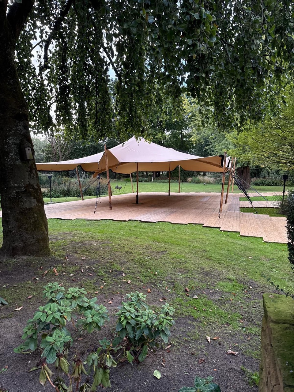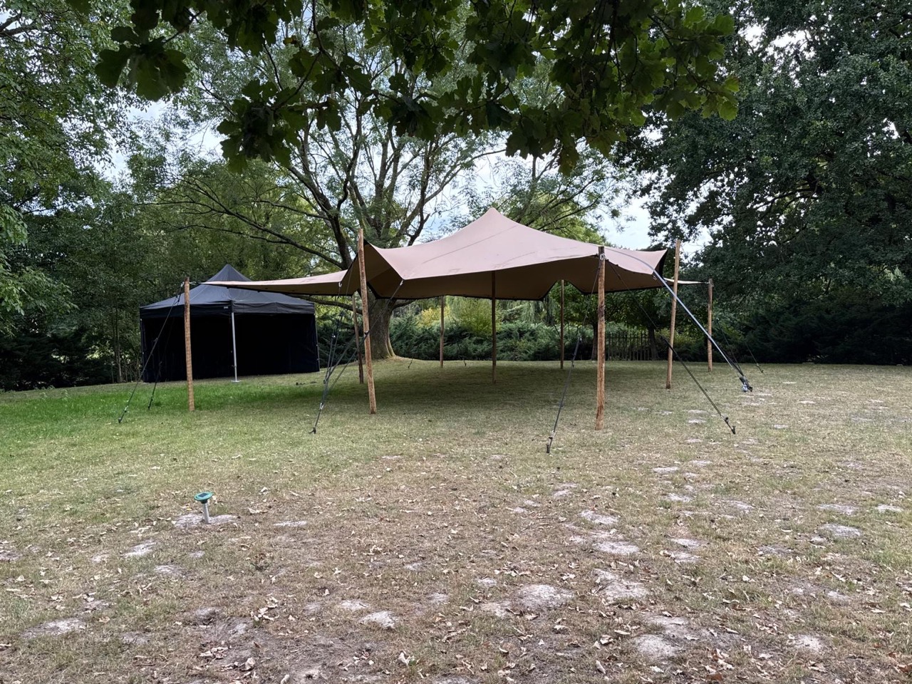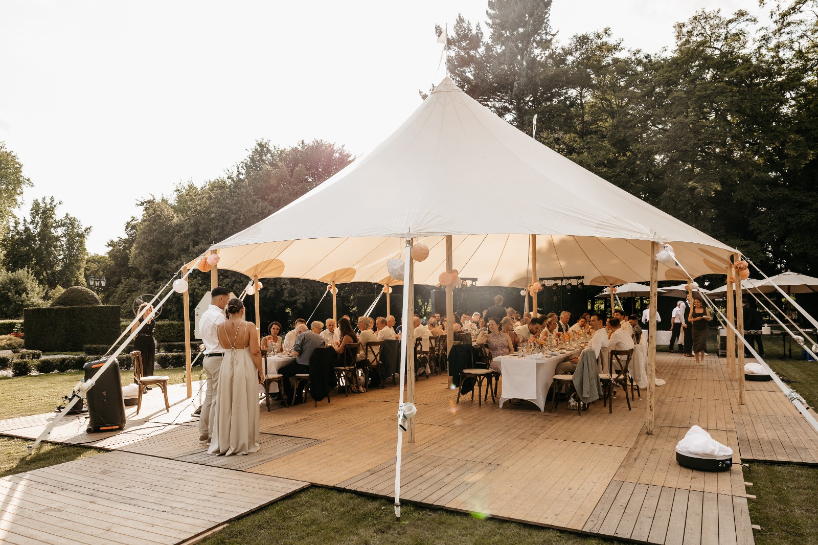 Diese Zelte sind ideal für Hochzeiten, Abendessen, Feierlichkeiten und hochwertige Firmenveranstaltungen. Dank des offenen, luftigen Designs entsteht eine wunderschöne Verbindung zur Umgebung – perfekt für Locations in der Natur, auf Landgütern oder in einem großzügigen Garten. Wenn der Abend hereinbricht, schaffen Lichterketten und Uplights eine magische Atmosphäre unter dem weichen Zeltdach.