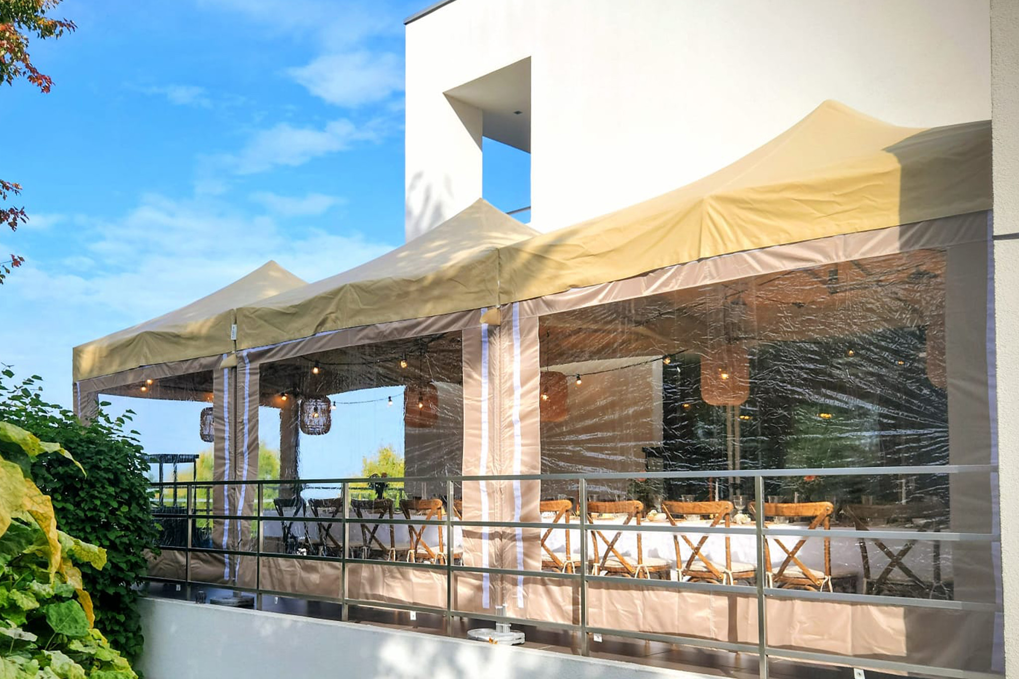 Unsere Sailcloth-Zelte sind die perfekte Wahl für alle, die Eleganz, Wärme und ein echtes „Premium-Event“-Erlebnis suchen. Das einzigartige lichtdurchlässige Tuch in Kombination mit den stilvollen Holzpfosten sorgt für eine romantische und luxuriöse Ausstrahlung, die sowohl tagsüber als auch abends stimmungsvoll zur Geltung kommt.